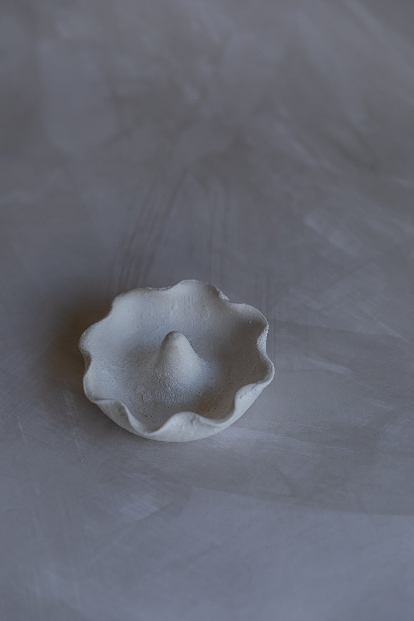 Inspired by the curve of a daffodil bloom frozen in an embrace of stone, the flutter ring dish features a raised edge that makes it both a ring holder and small bowl in one.