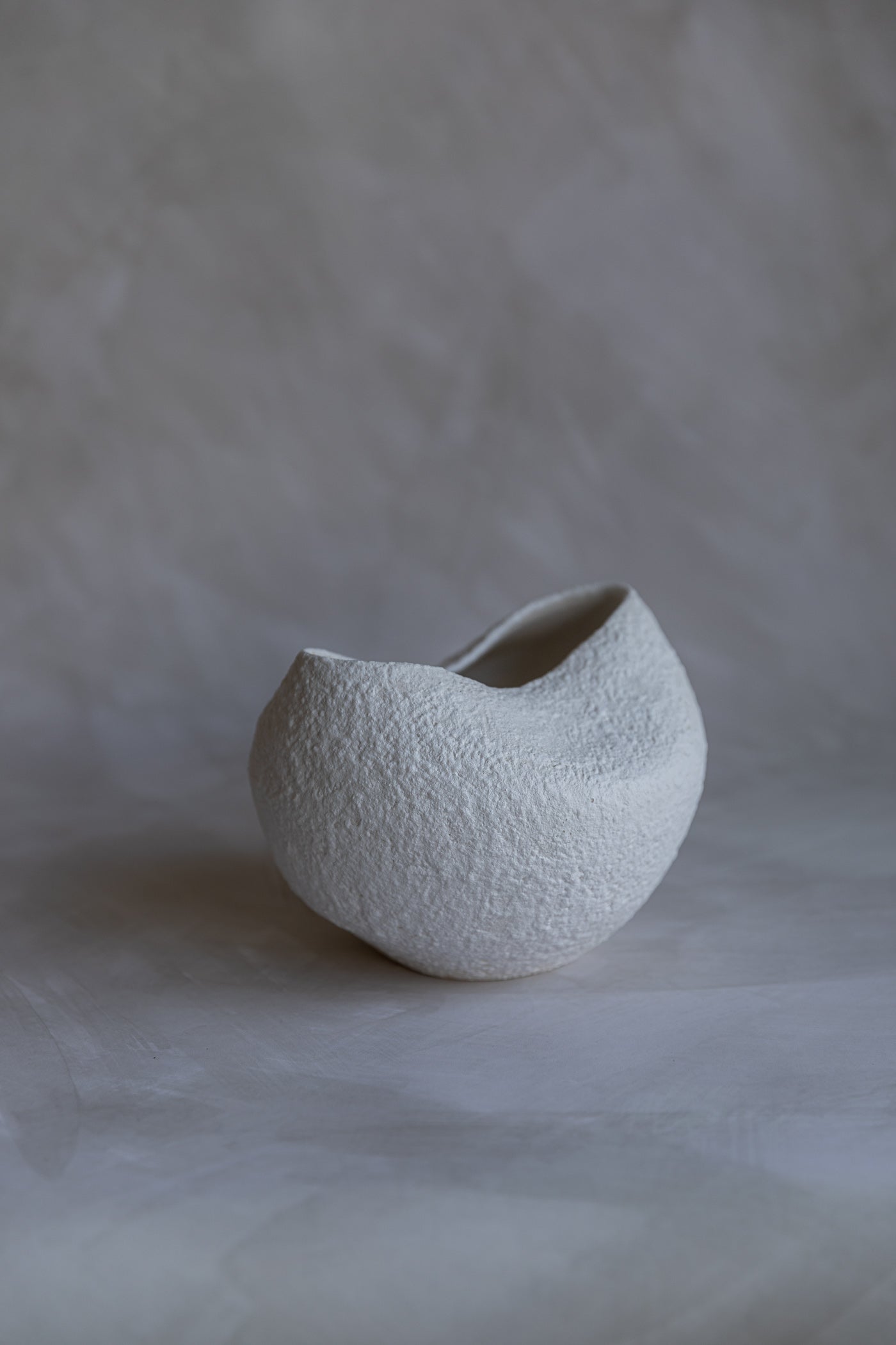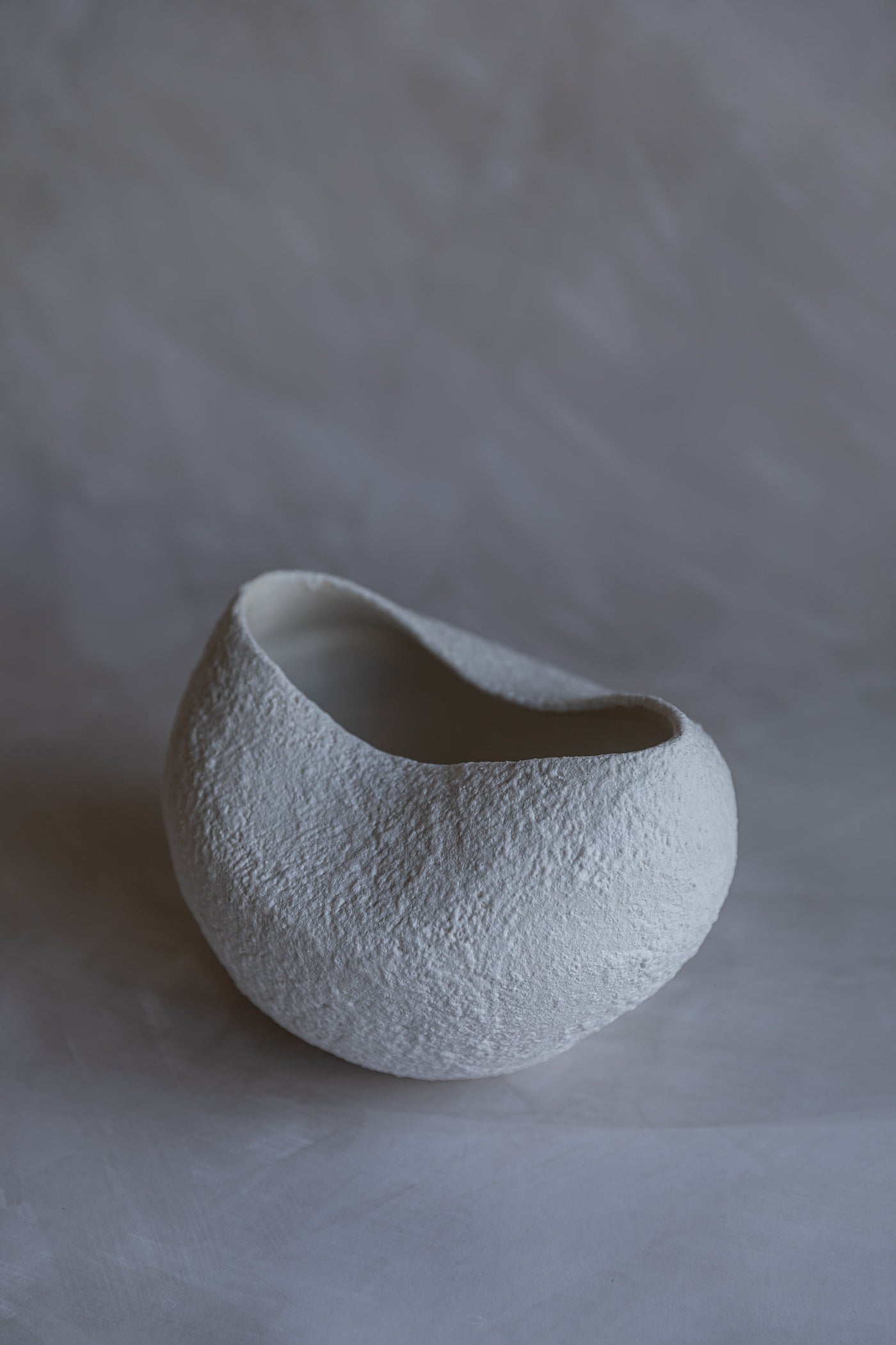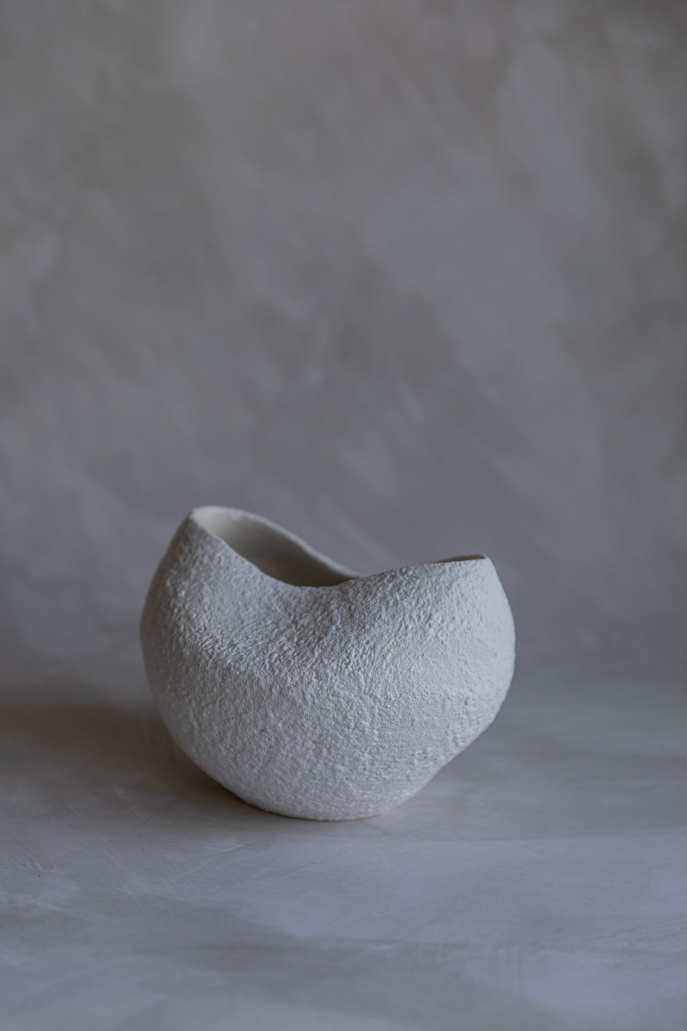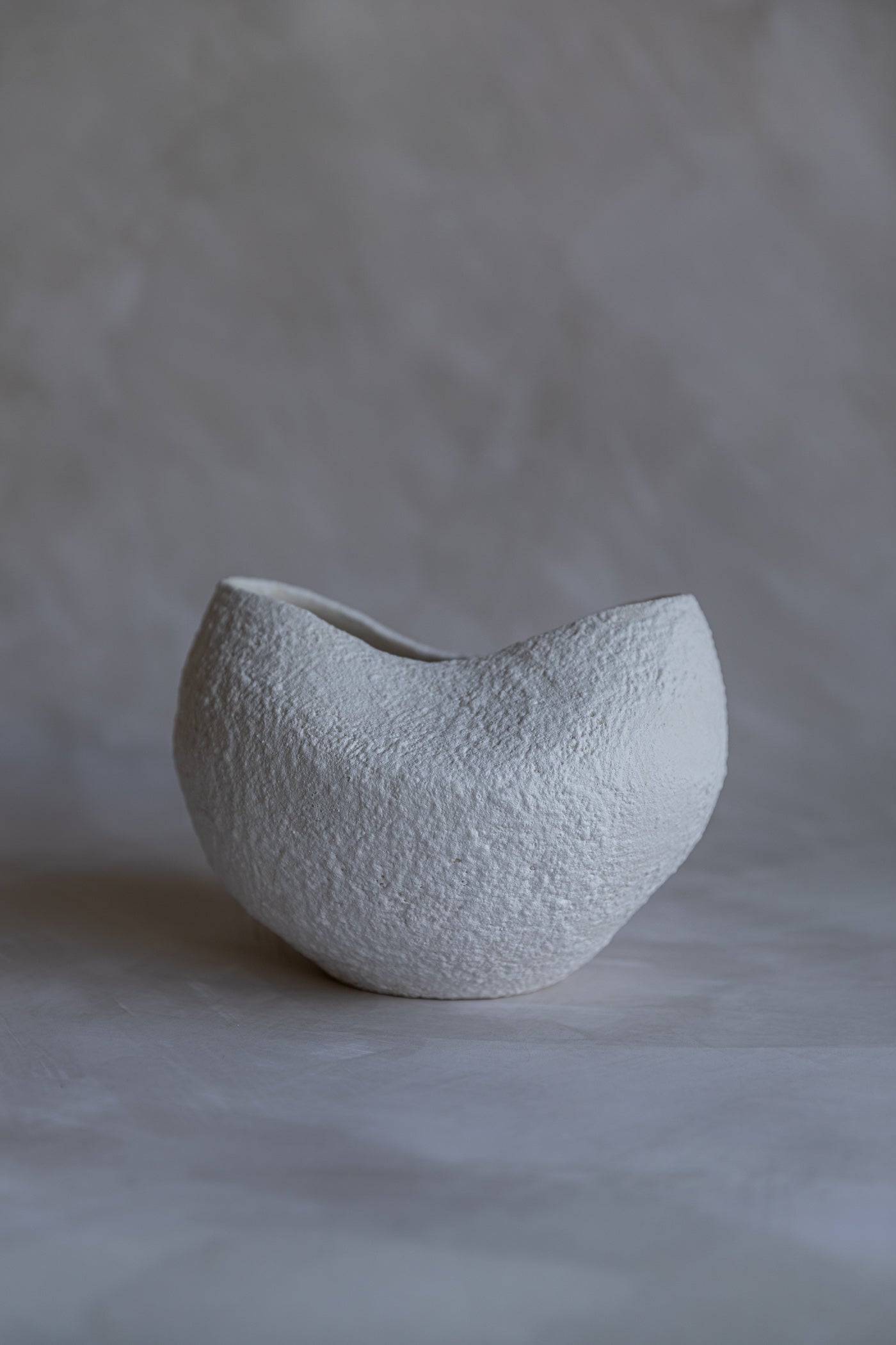 Wheel thrown and hand altered from mid-fire stoneware this vessel is unique unto itself. The inside is coated with a smooth matte glaze and the outside is coated with a textural glaze is applied by hand with a large fan brush, meant to replicate the unique characteristics of stone.