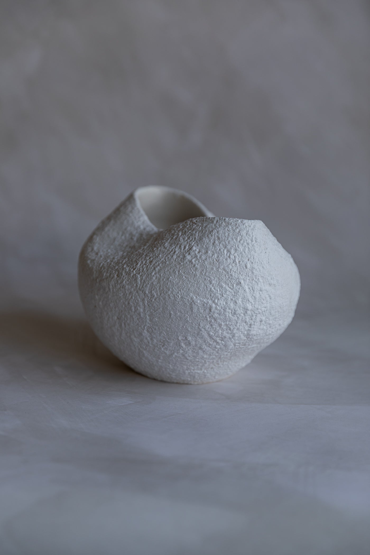 Inspired by the curve of a garden stone, the stone vessel has a spherical shape that has been altered, as if time has had a way with it with each passing day.